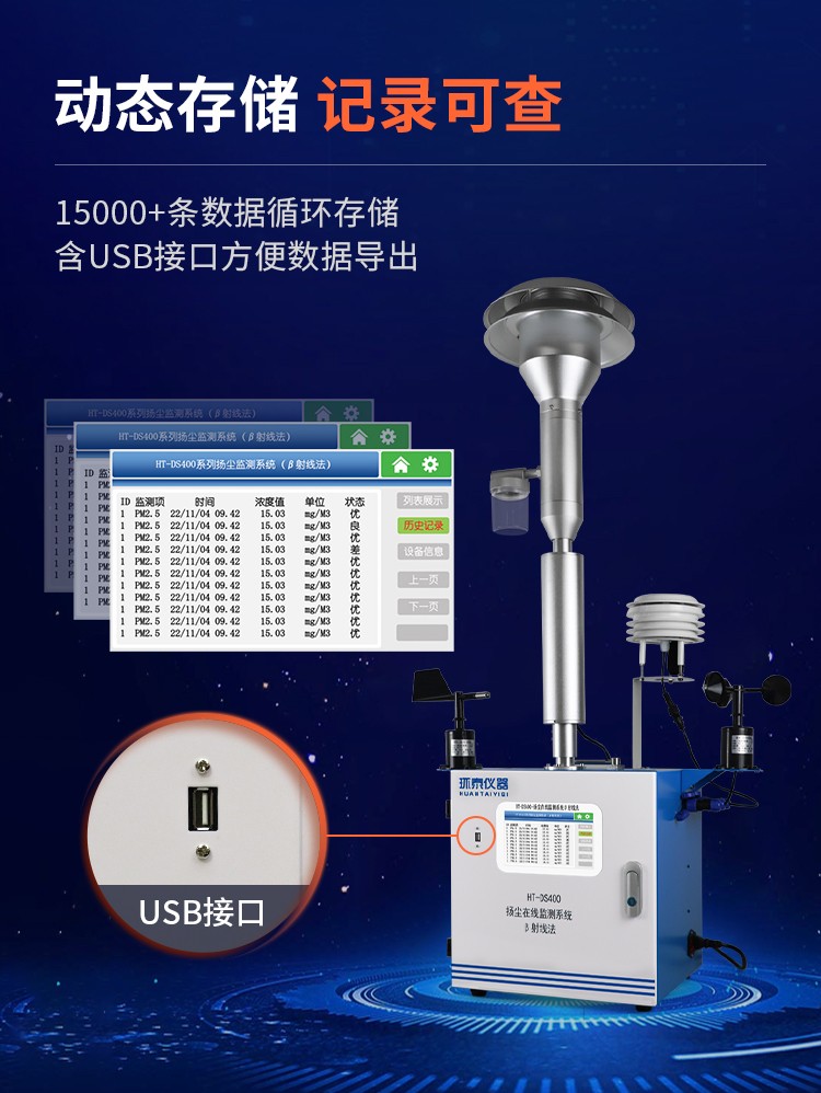 除了实时治理与精准监测,HT-DS400扬尘在线监测系统(β射线)还具备强大的数据管理与运维优势。系统每小时间隔自动采样并记录数据,动态存储超15000条记录,并通过USB接口便捷导出,为环保核查提供完整依据。企业可通过电脑或手机远程查看实时状态,大幅降低人工巡检成本与操作难度。模块化设计允许按需配置监测因子,灵活适应码头、工地等复杂场景。HT-DS400扬尘在线监测系统的监管模式不仅能助力企业合规经营,更能通过自动化手段提升环境管理效率,实现经济效益与环保责任的双重提升。