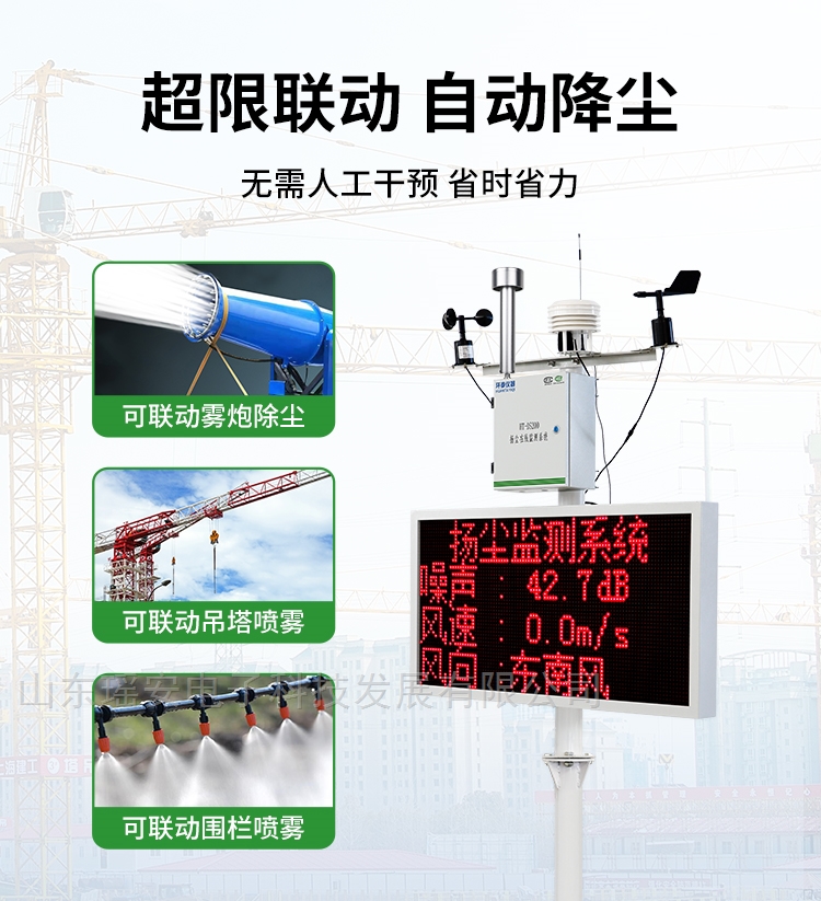 7、安全可靠:超标自动联动,无需人工干预,可联动雾炮除尘、可联动吊塔喷雾、可联动围栏喷雾,安全省心
