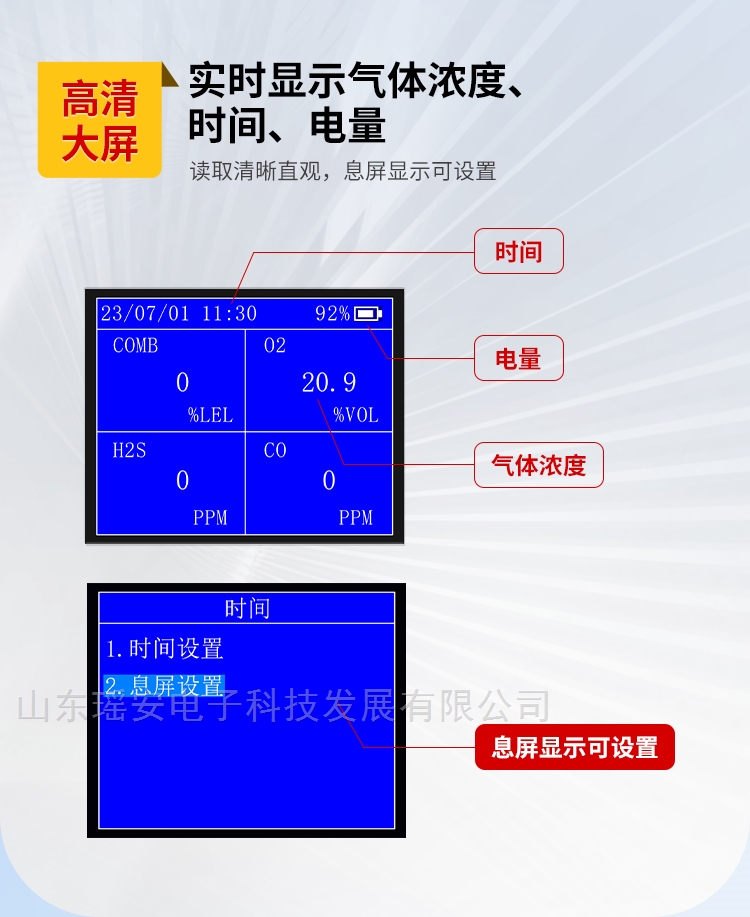 2.液晶屏显示实时显示气体浓度、时间、电量,息屏显示可调节