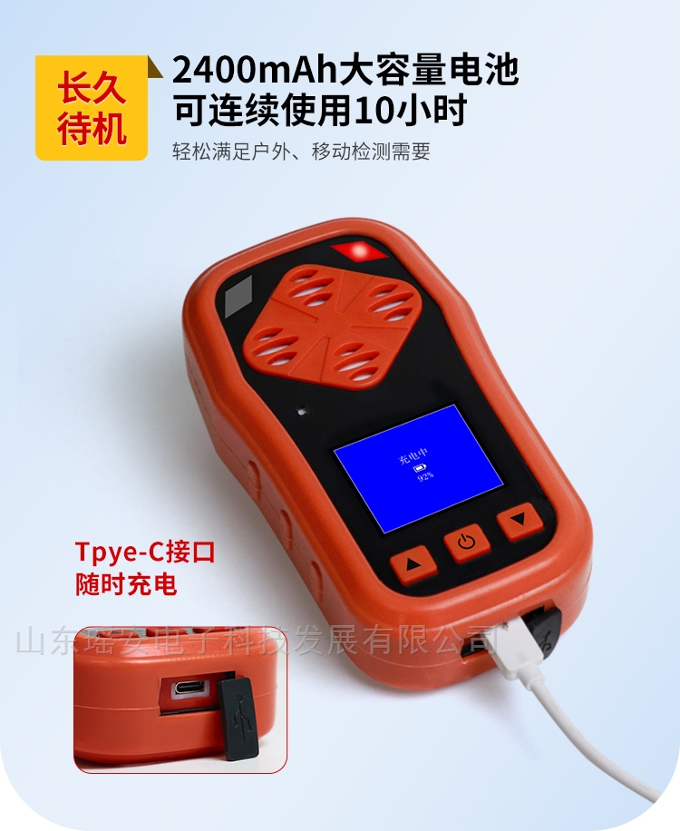 当检测到有害气体浓度超过预设阈值时,报警仪会立即启动多重报警系统,包括声光报警、高低报报警以及故障报警,确保工作人员能够及时采取应对措施。同时,2400mAh大容量电池保证了报警仪的长时间待机,连续使用可达10小时,满足了长时间作业的需求。